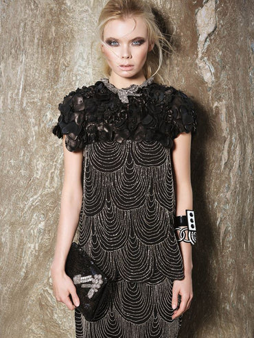 The crochet workmanship with metal thread and Swarovski crystals characterizes these completely handcrafted creations.